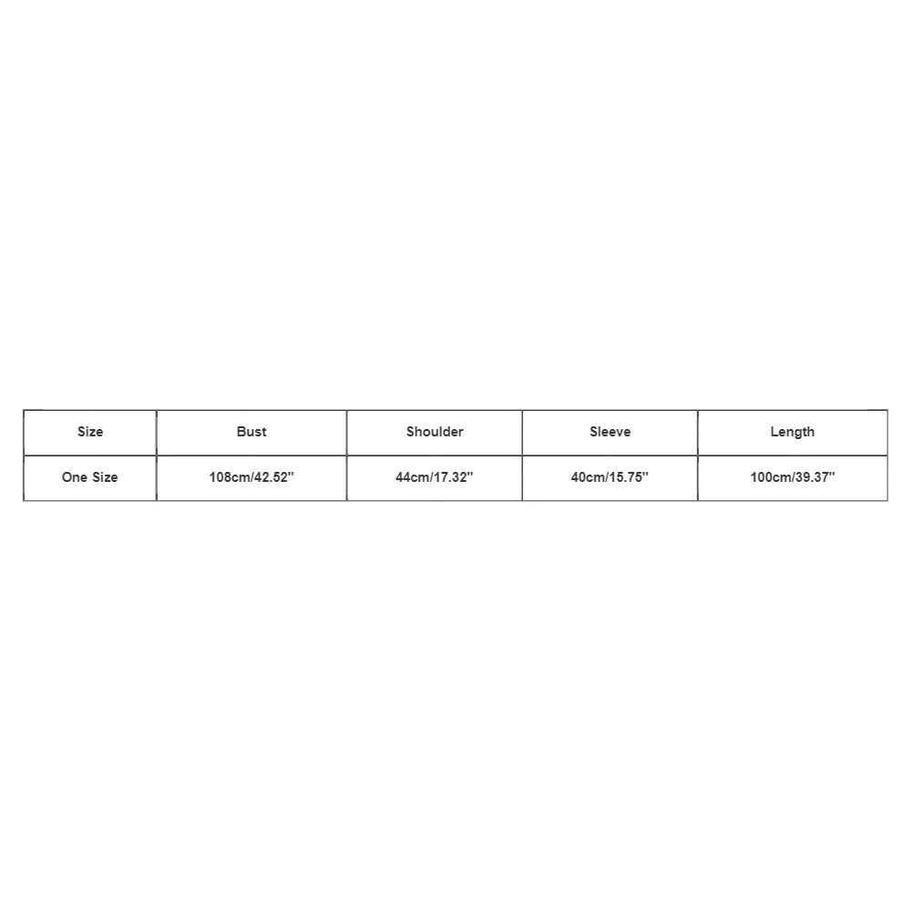 | Size:One Size | Bust:108cm/42.52'' | Shoulder:44cm/17.32'' | Sleeve:40cm/15.75'' | Length:100cm/39.37'' |