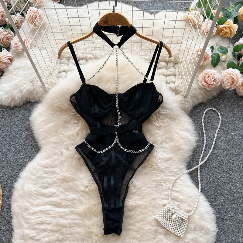 CHILLGIO Sexy Chain Strappy Bodysuit - Fashion Chic Streetwear Catsuit Combination Lingerie Halter Mesh Rompers