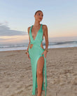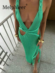 Sexy Green V-Neck Backless Dress for Women with High Slit - Knit Hollow Long Dress for Summer Beach Club 2025