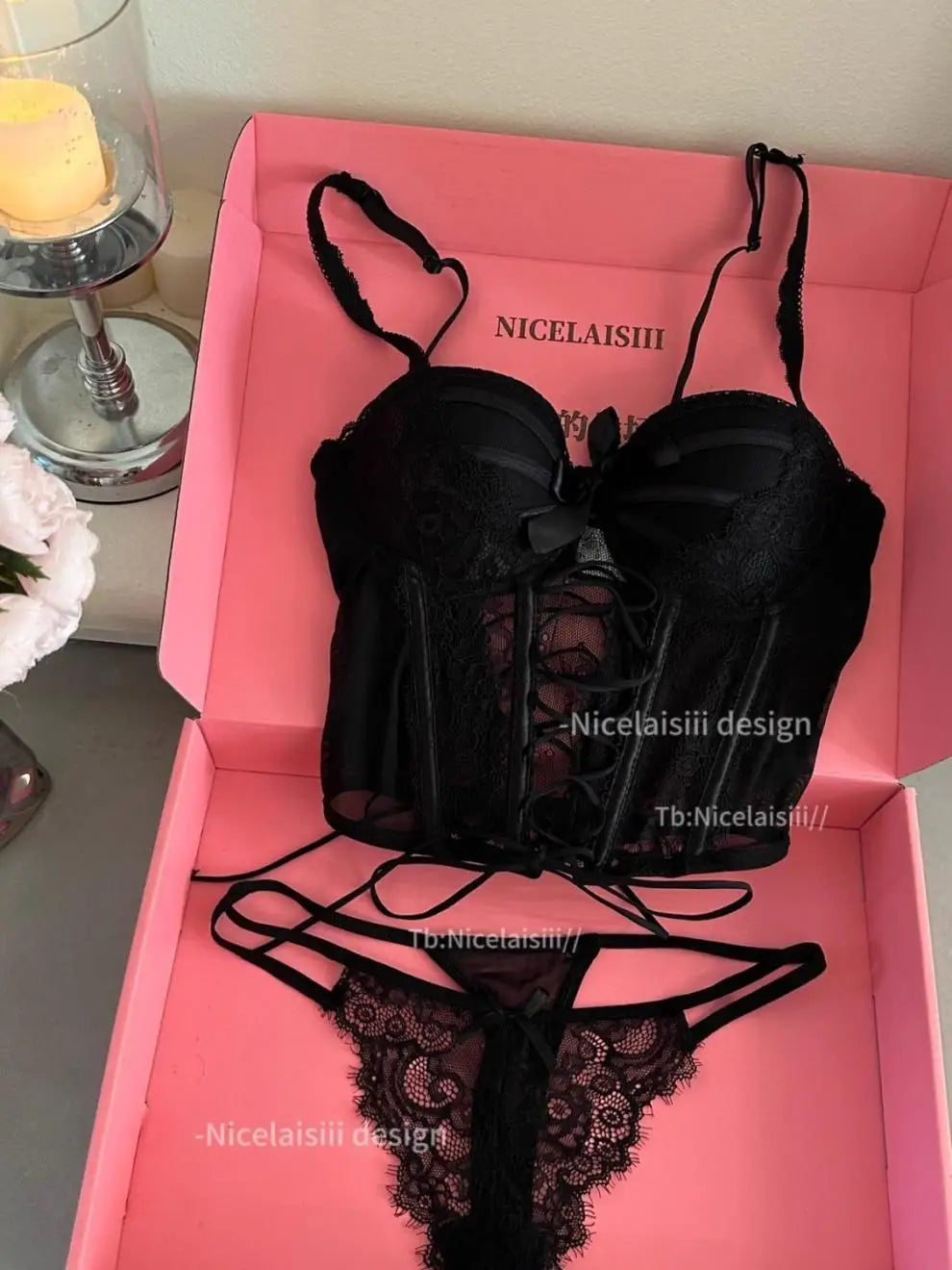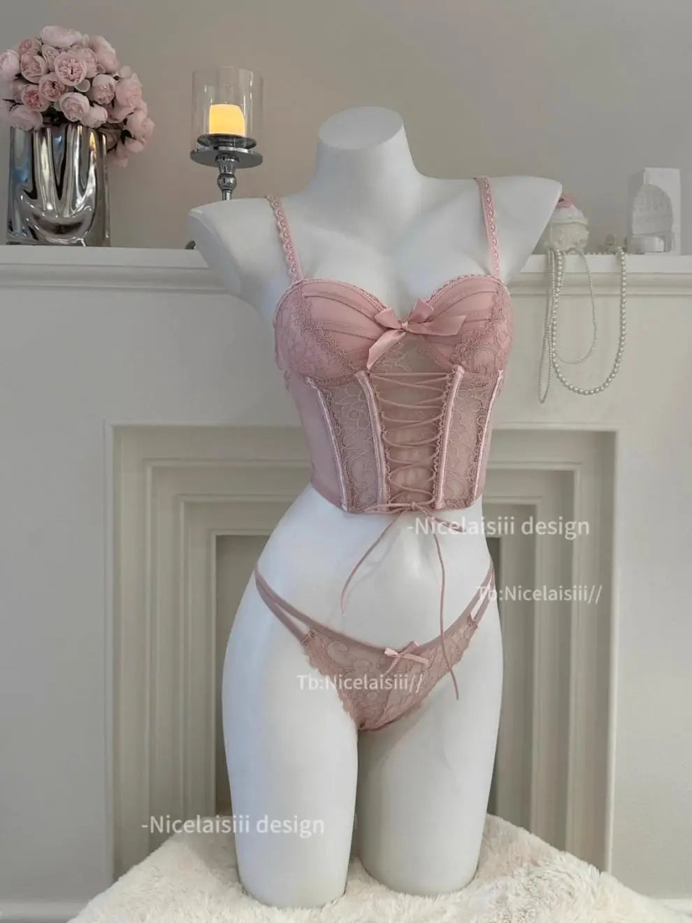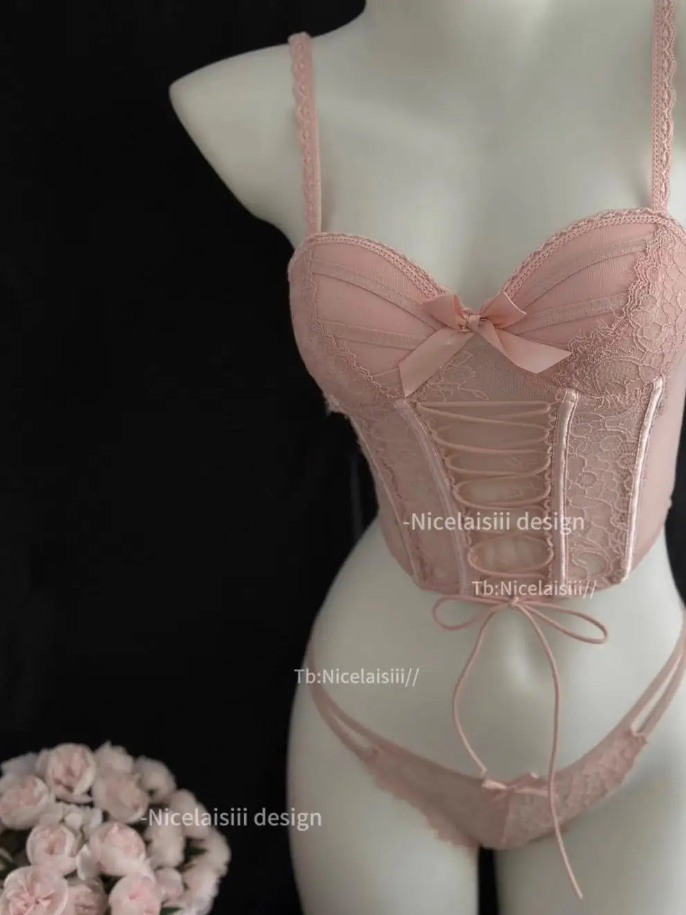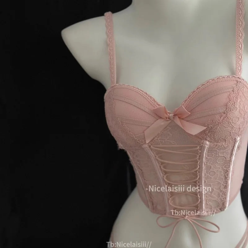 Sexy Lace Bra Set Sweet Fishbone Halter Tank Top with Bra Pads Gathered Top Thin Bottom Thick Design Women's Lingerie Set