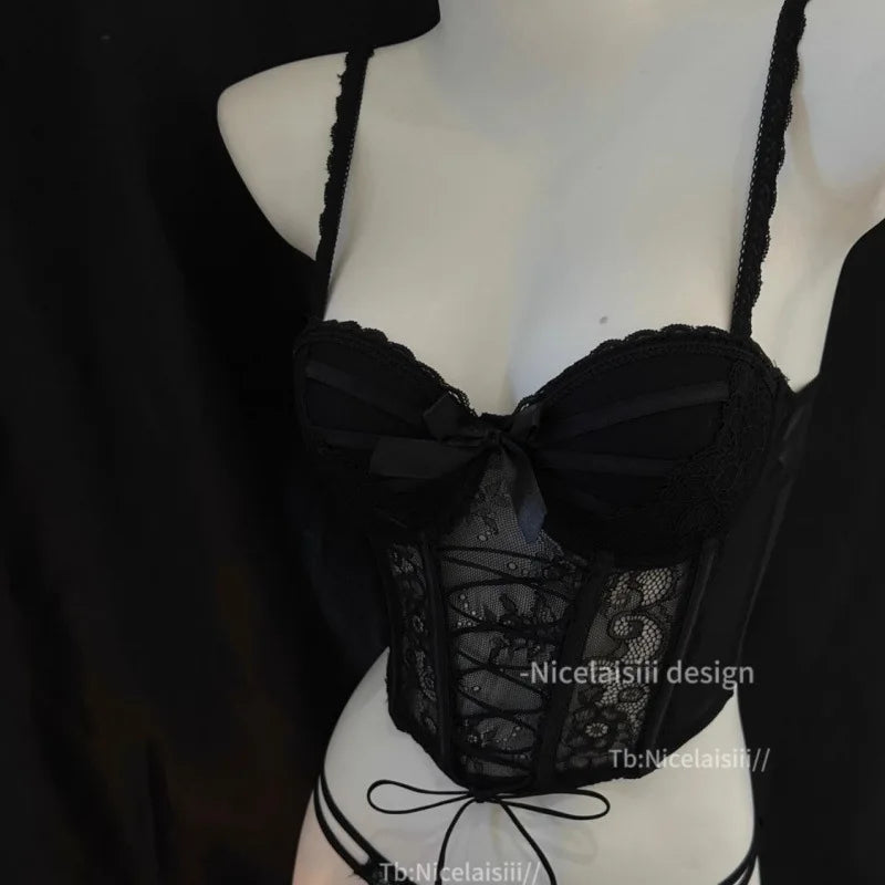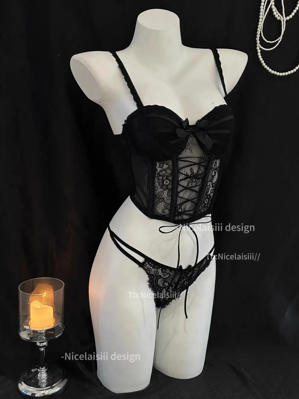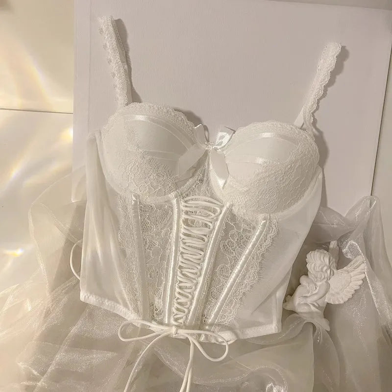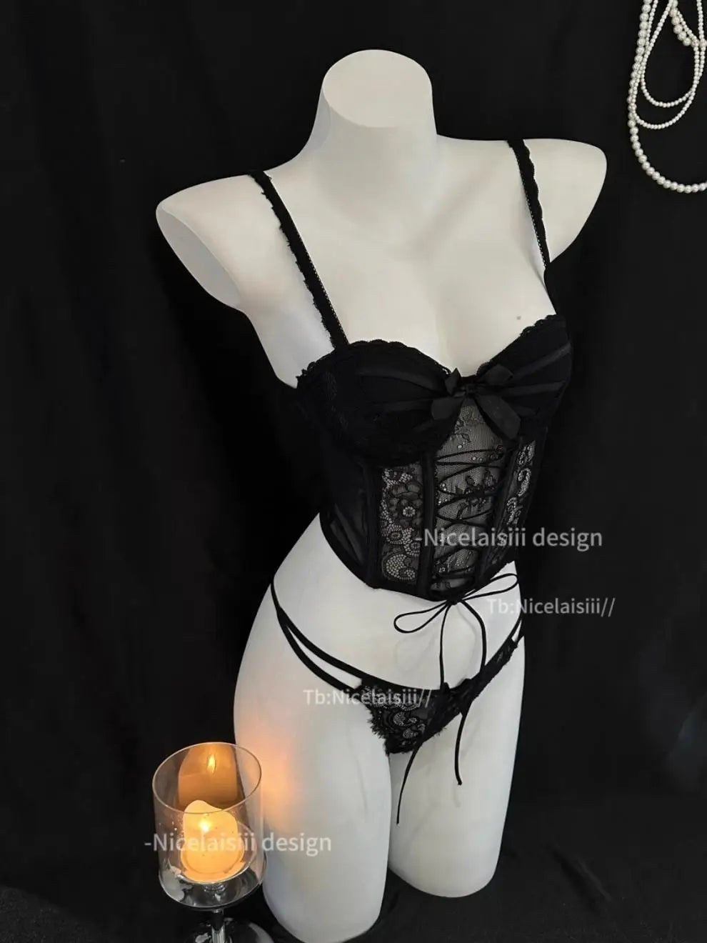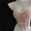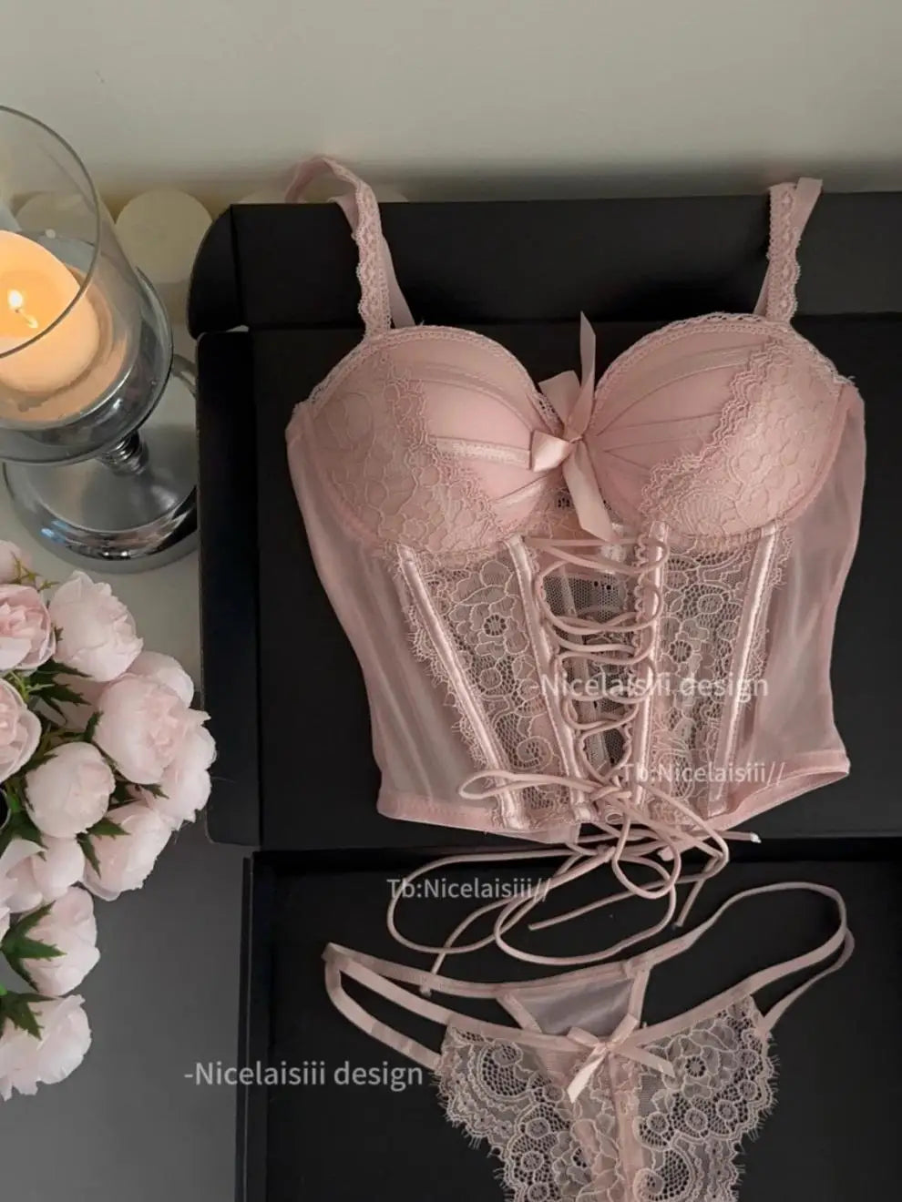 Sexy Lace Bra Set Sweet Fishbone Halter Tank Top with Bra Pads Gathered Top Thin Bottom Thick Design Women's Lingerie Set