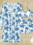 Women's Three Piece Swimsuit Set - Draw Rope Print High Waist Long Sleeve Smock Split Bikini Set